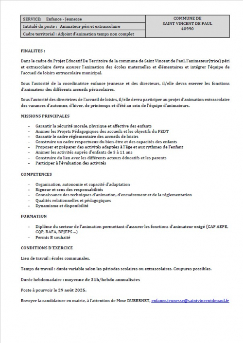Envoyer la candidature en mairie, à l’attention de Mme DUBERNET par mail à enfance.jeunesse@saintvincentdepaul.fr